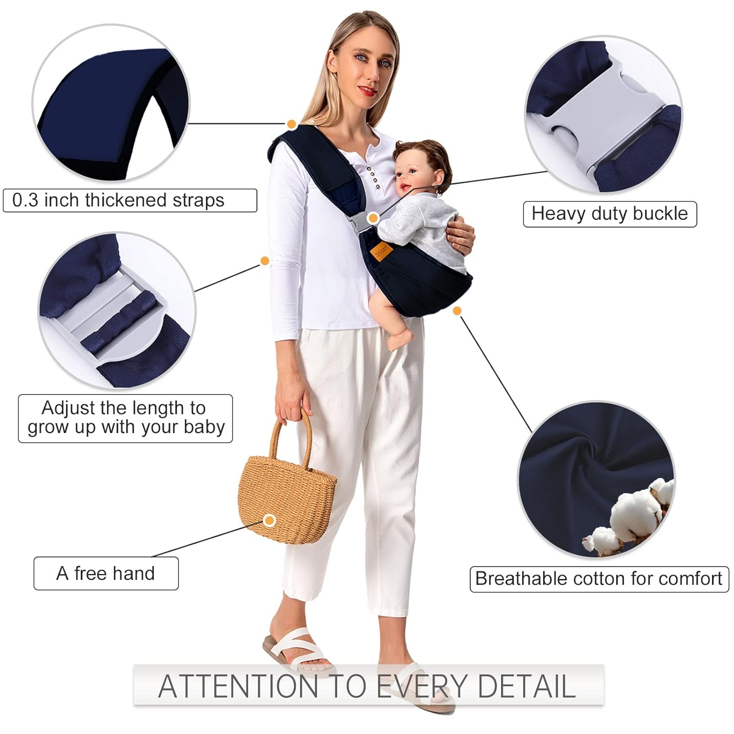 【1 - 48 Month of Age】 Baby sling carrier has adjustable function for height, You can adjust the length of shoulder straps according to your baby's different growth stages. Suitable for children 7 – 45lbs. The shoulder has 0.3 inch padding for added comfort.